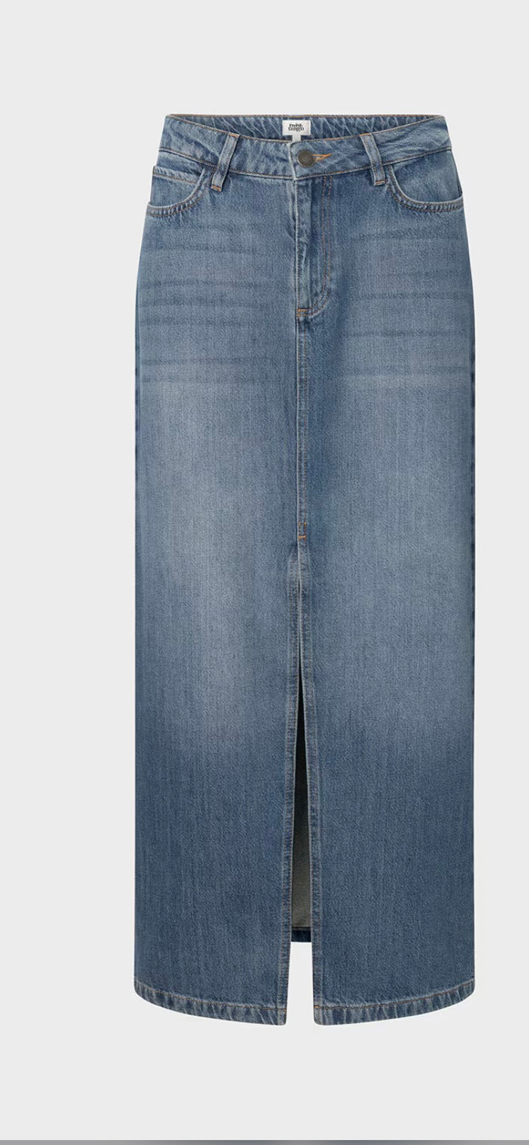 Jeanskjol med lång midilängd med rak passform och normal midja, praktiska funktioner med 5 fickor, bälteshällor och en metallisk knapp- och dragkedja. Perfekt för eleganta outfits utan ansträngning