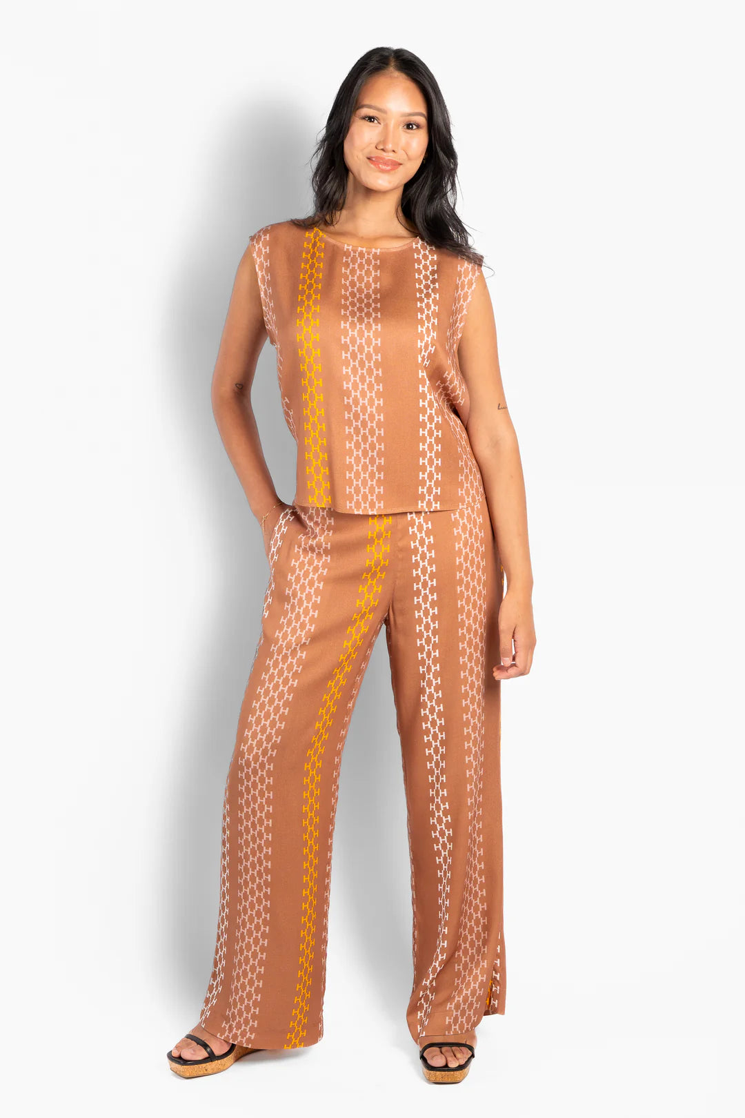 En lätt, ärmlös topp tillverkad i mjuk och följsam viskos för en luftig sommarkänsla. Designad med en avslappnad silhuett och ett mjukt fall, och prydd med HÉSTs signaturmönster över hela plagget för en sofistikerad grafisk touch. Avslappnat elegant, ett stilrent statement-plagg som lyfter din vardagslook.