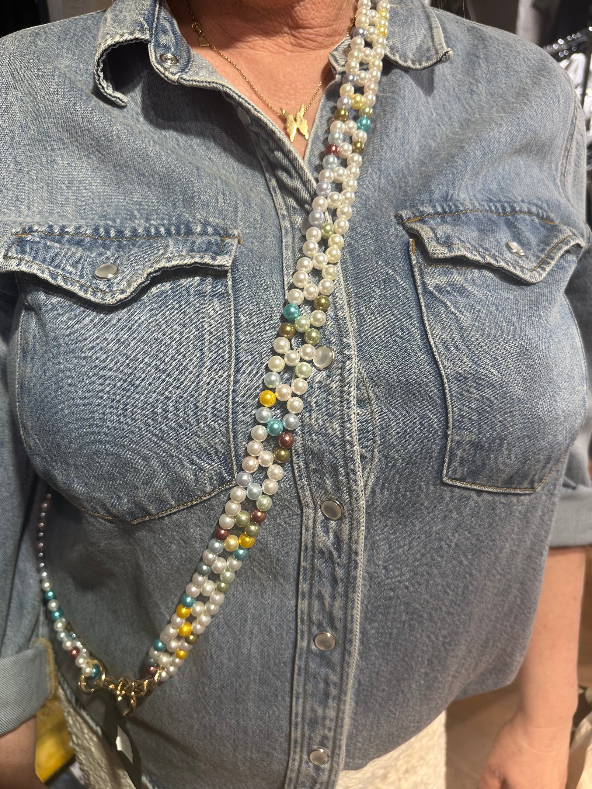 La Luna Handsfree Long multi är den pärldekorerade långa remmen som låter dig bära och ta med din telefon på ett elegant och sofistikerat sätt.