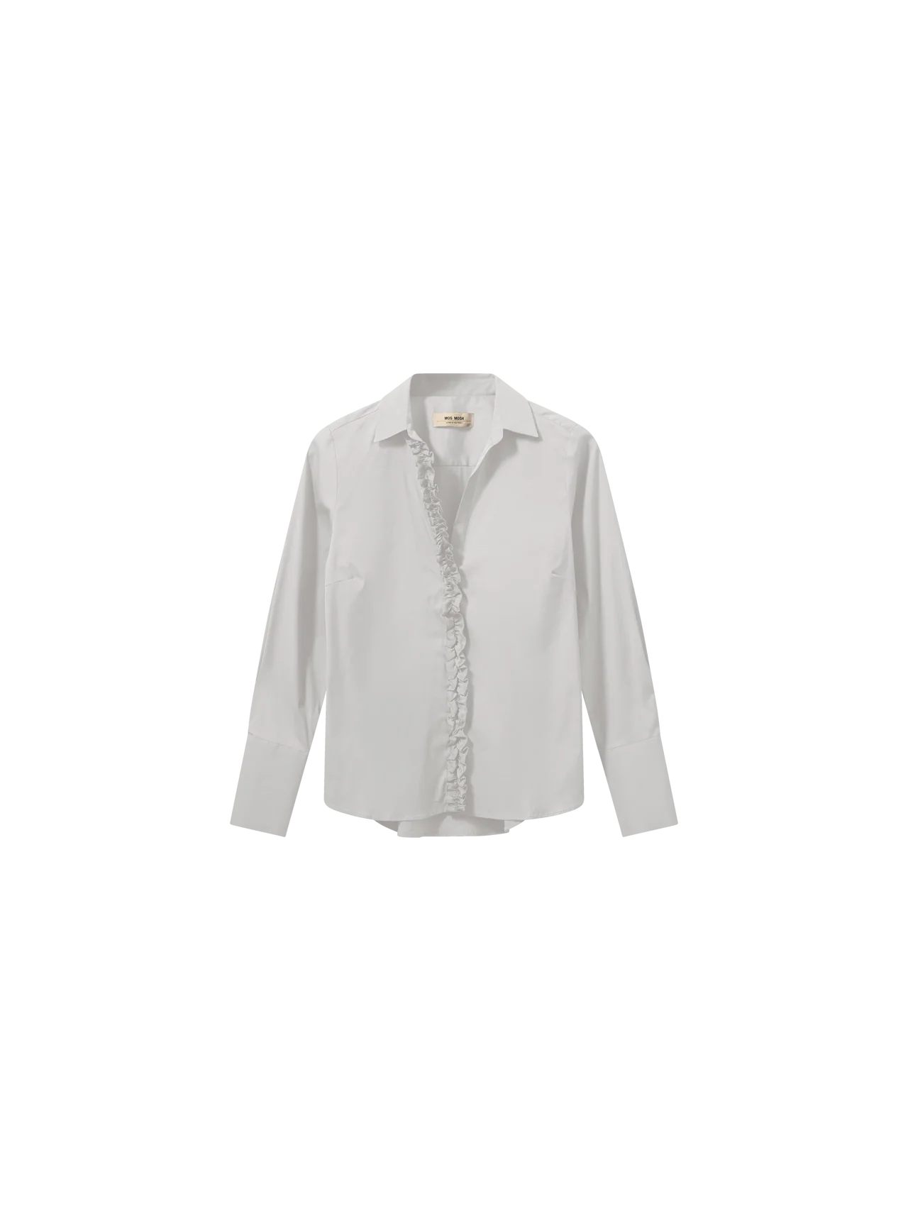 Denna fantastiska skjorta är designad i en normal passform med en elegant v-ringning som avslutas med en klassisk knappstängning. Den är dekorerad med snygga volangdetaljer framtill och har långa ärmar med knäppbara manschetter. Vi skulle matcha den med blå eller bruna jeans, eller ta stilen till nästa nivå med skräddade byxor