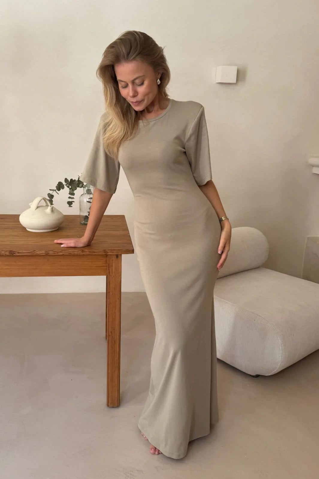 T-shirtklänning från BYIC i khaki. Den har en figurnära silhuett från topp till tå och korta ärmar med rund halsringning.