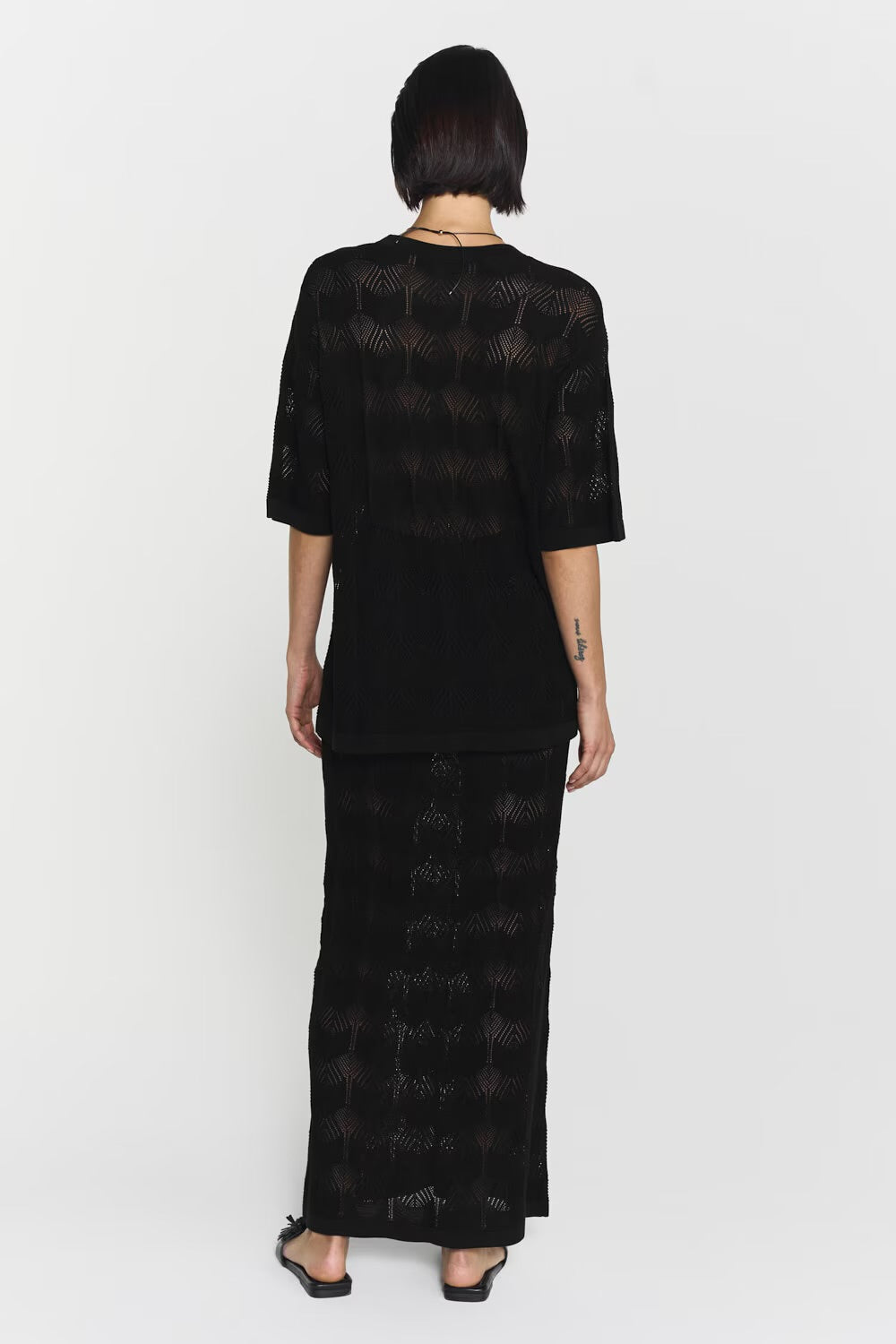 The Uma Tee is crafted from soft crochet knit using Tencel yarn, offering a loose fit with short sleeves and a rounded neckline. Pair it with the Ziatra Crochet Skirt for a stylish ensemble.