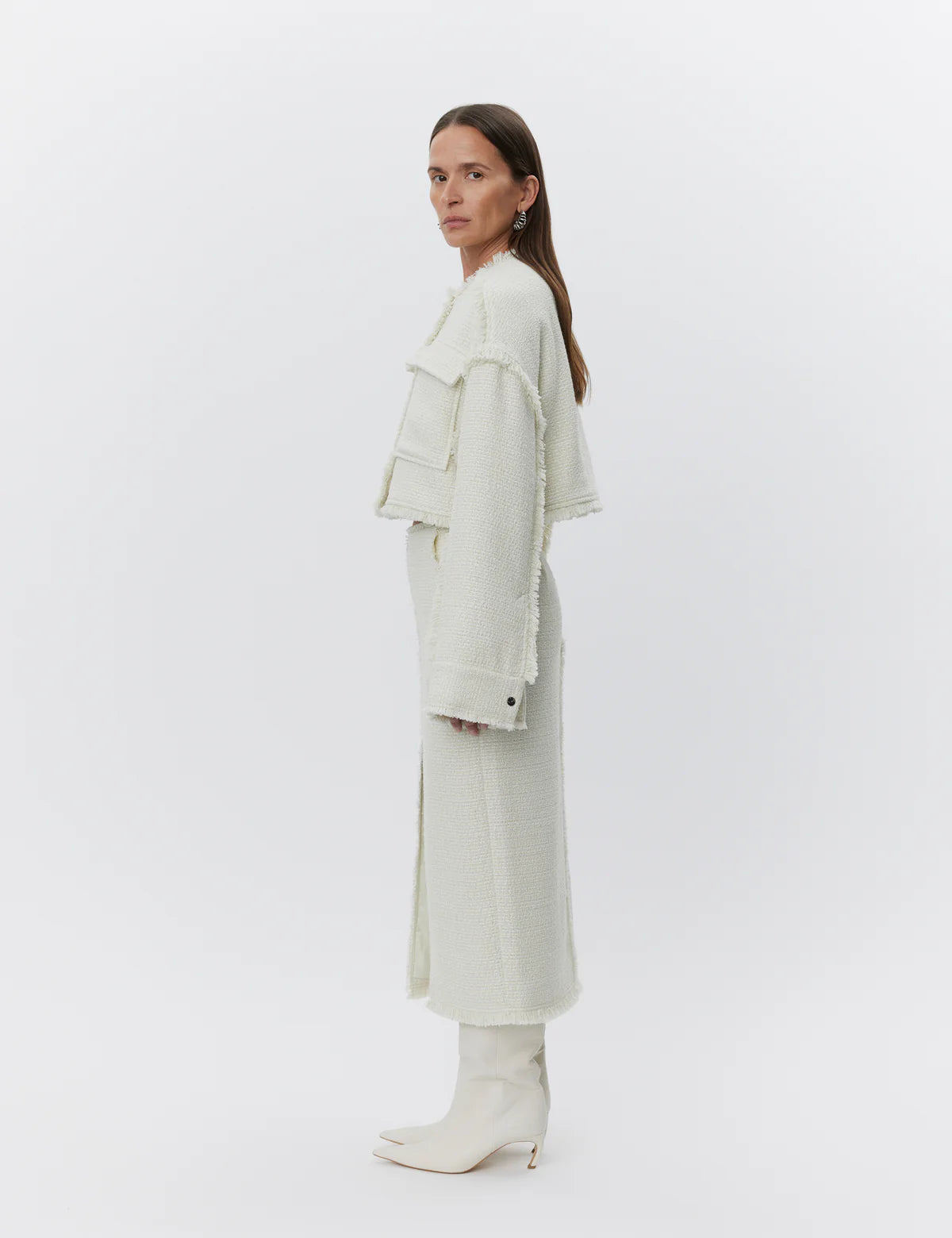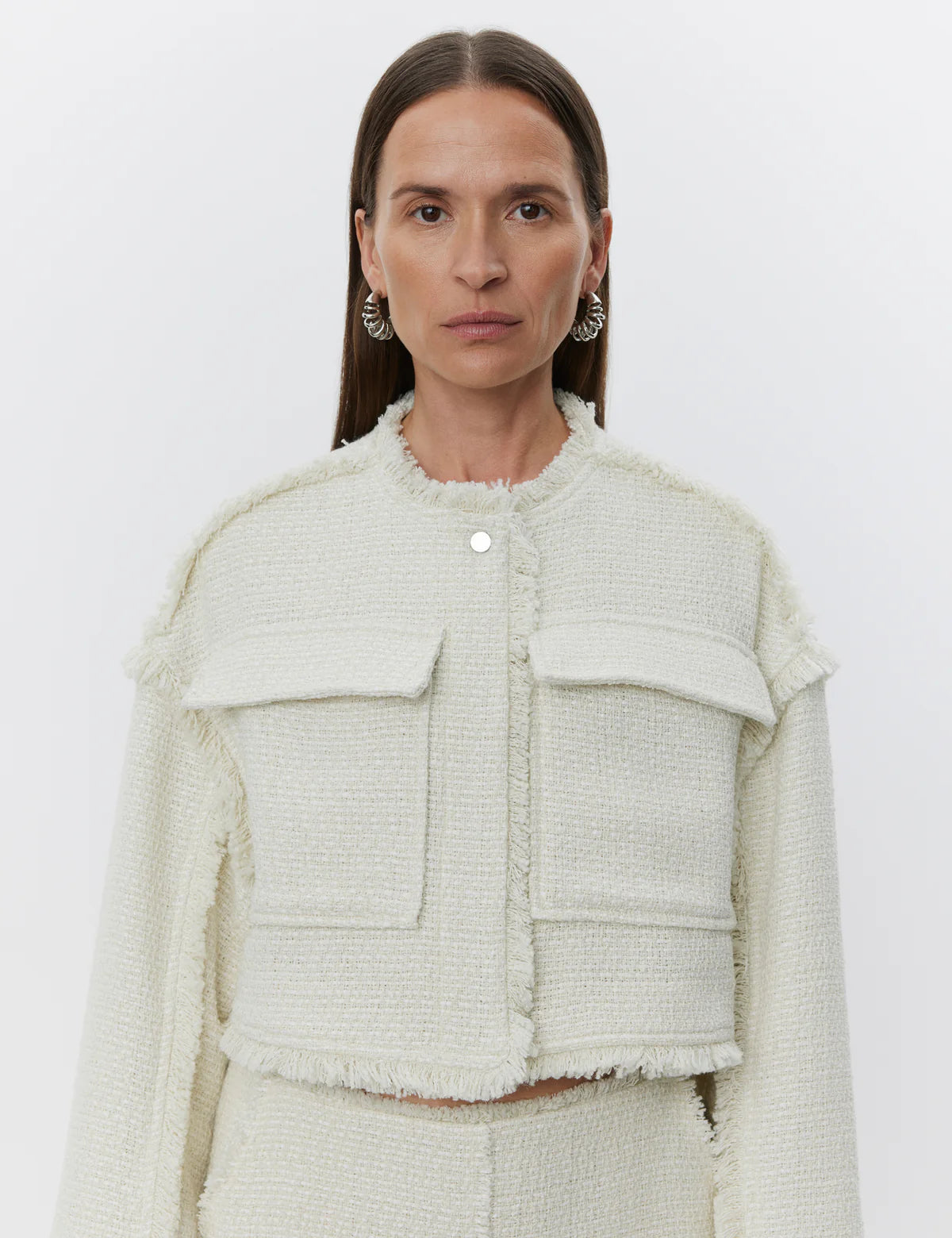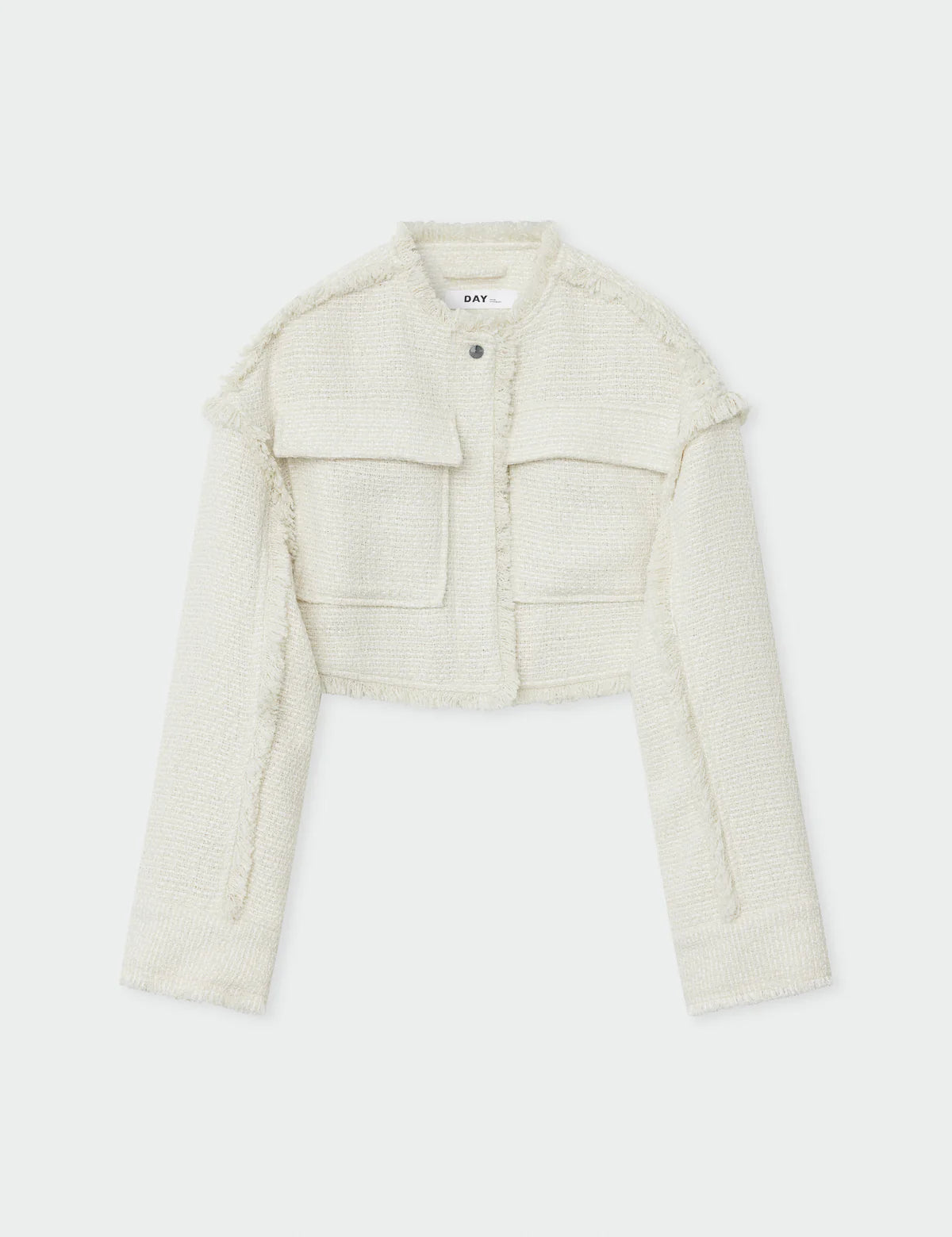 This cropped, textured jacket features patch pockets on the chest, snap button closures, and fringe detailing throughout the body. The jacket is fully lined and has a loose fit.