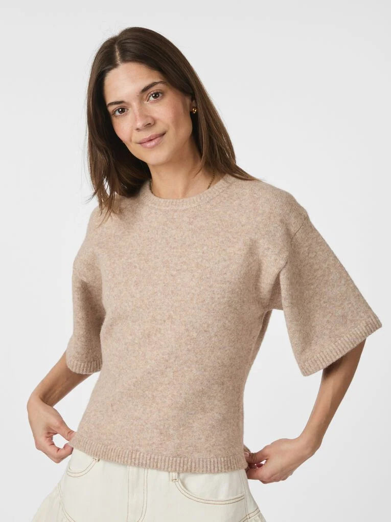 Stickad t-shirt med rund halsringning, kort ärm med nedhasade axlar och ribbade kanter. Den har en boxy, löst passform över axeln och på ärmarna, medan passformen på kroppen är mer åtsittande. Modellen bär storlek 36.