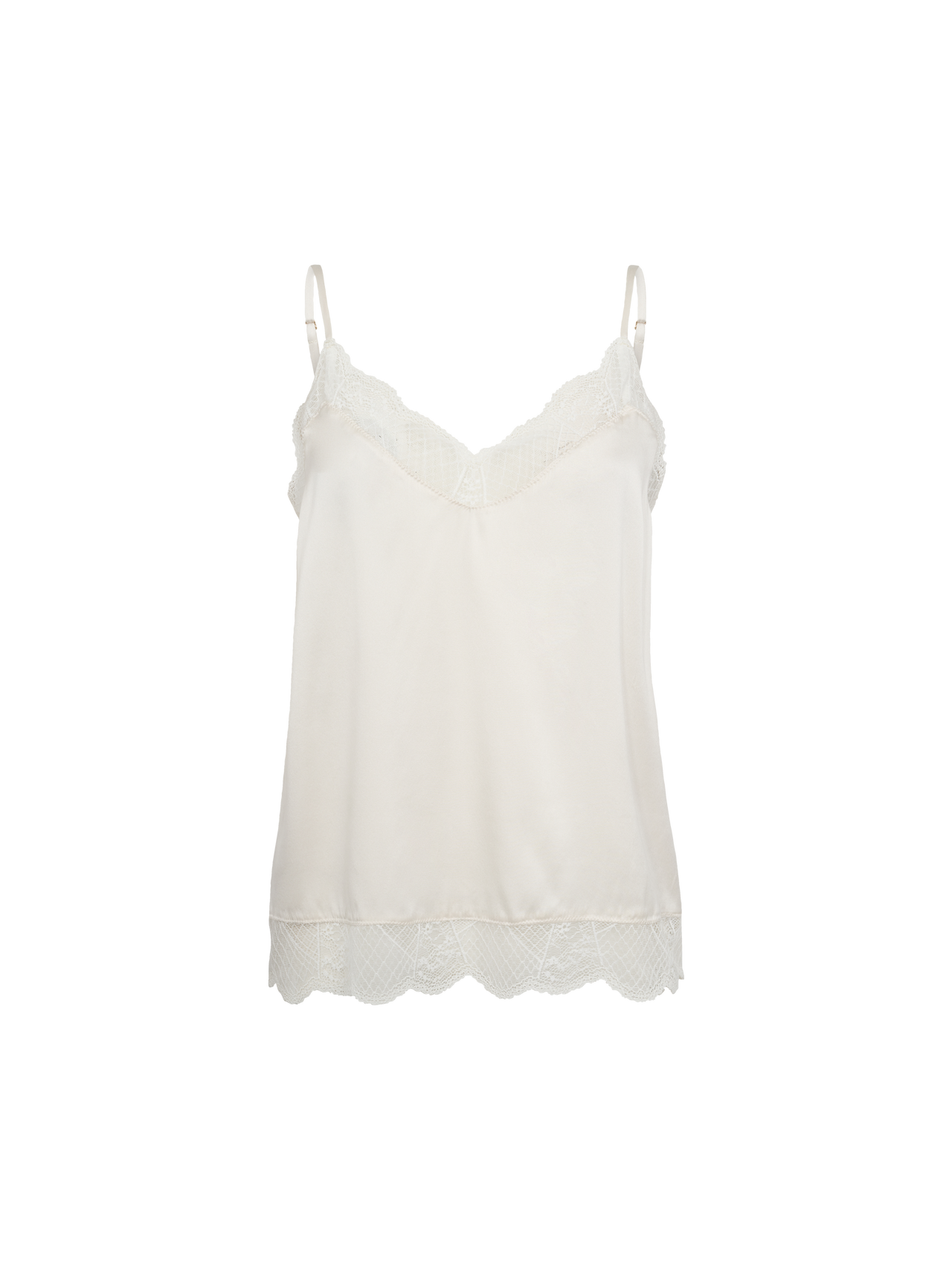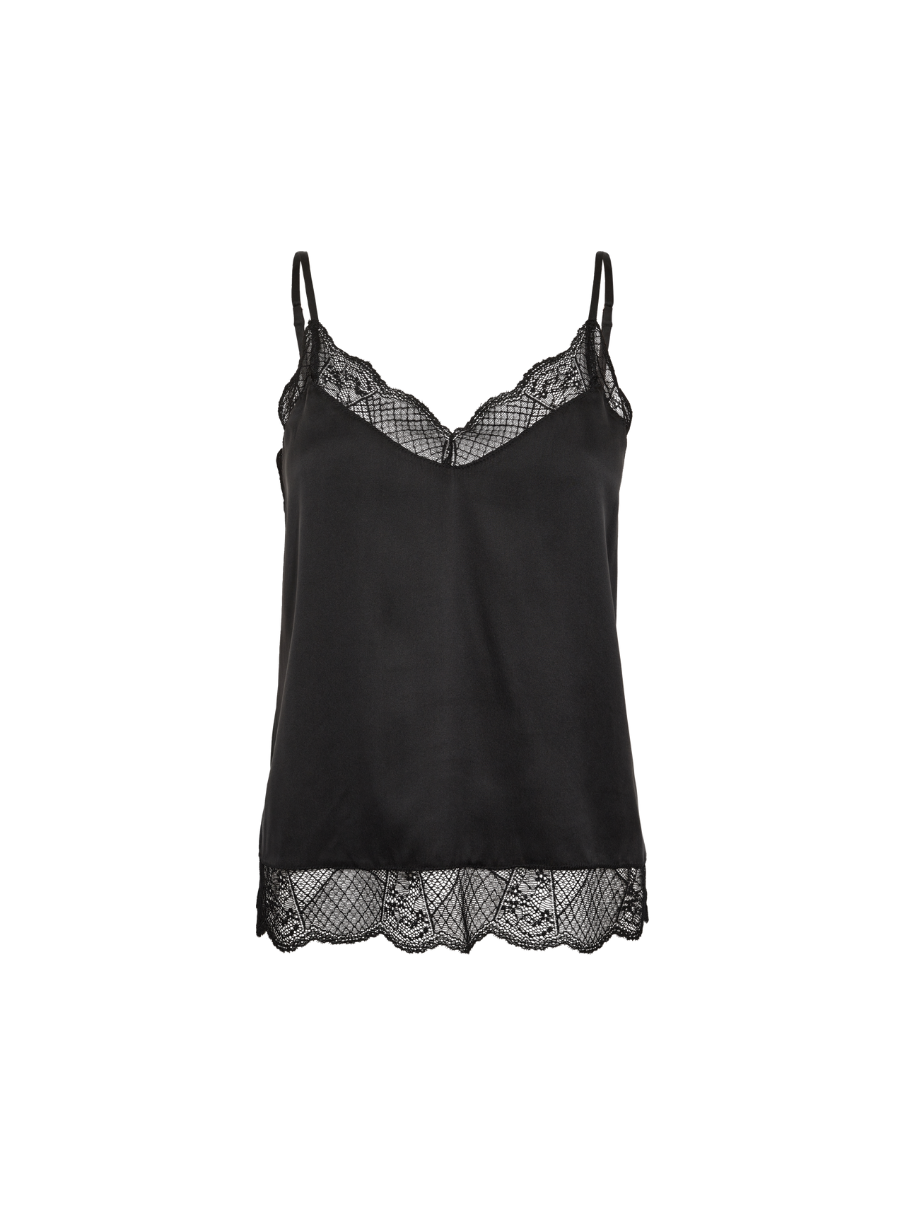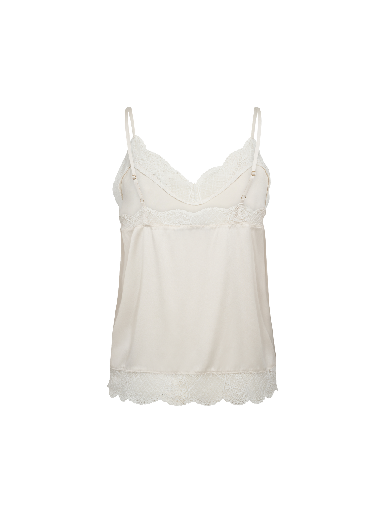 Add a touch of femininity to your look with this exquisite silk singlet, delicately crafted with a touch of stretch for comfort. Adorned with lace details along the neckline and bottom hem. Pair it effortlessly with a tailored blazer and jeans for a sophisticated look or balance with a leather jacket to give it an edgy feel.