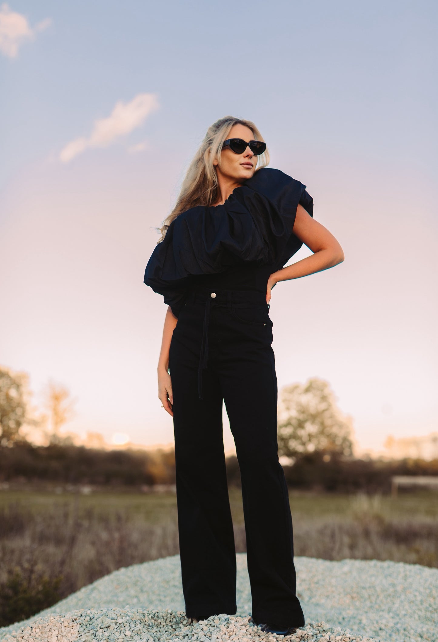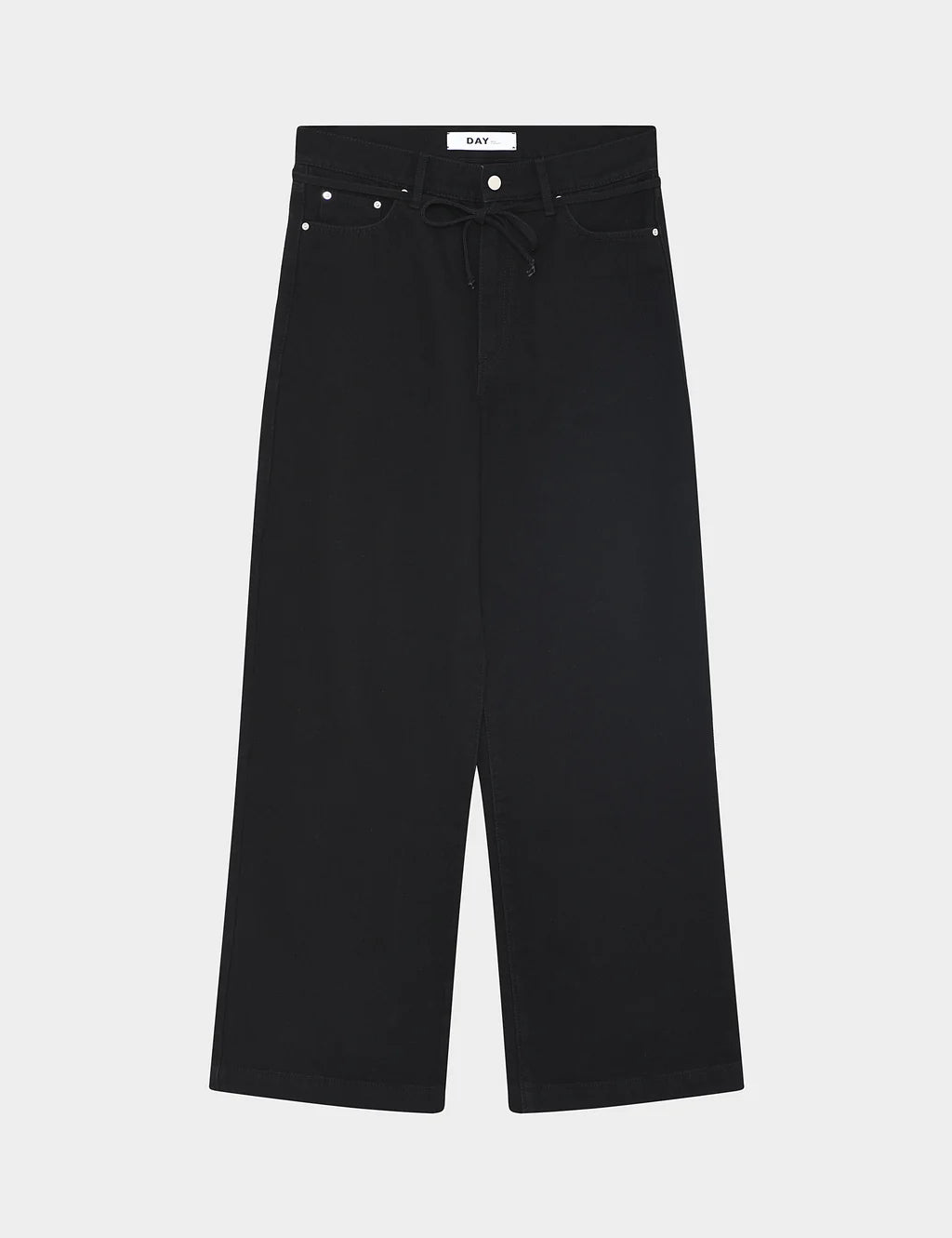 These low-rise, straight-leg jeans feature five pockets, a zip fly with button closure, and a removable tie belt at the waist. The jeans have a loose fit.