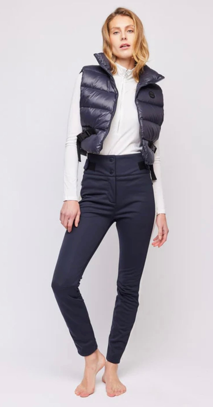 Bonnie is a short down vest with high neck and zipper at front. The vest has adjustable straps with buckles in sides. Chest features inner pocket and a logo badge. Black badge and straps on all colorways.
