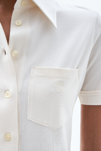 Jersey Short Sleeve Shirt är inspirerad av Filippa K:s historia. I elfenbensvit ekologisk stretchbomull har den en smal passform och färgat 93-monogrambroderi. Styla med tonala skräddarsydda byxor eller din favoritdenim.