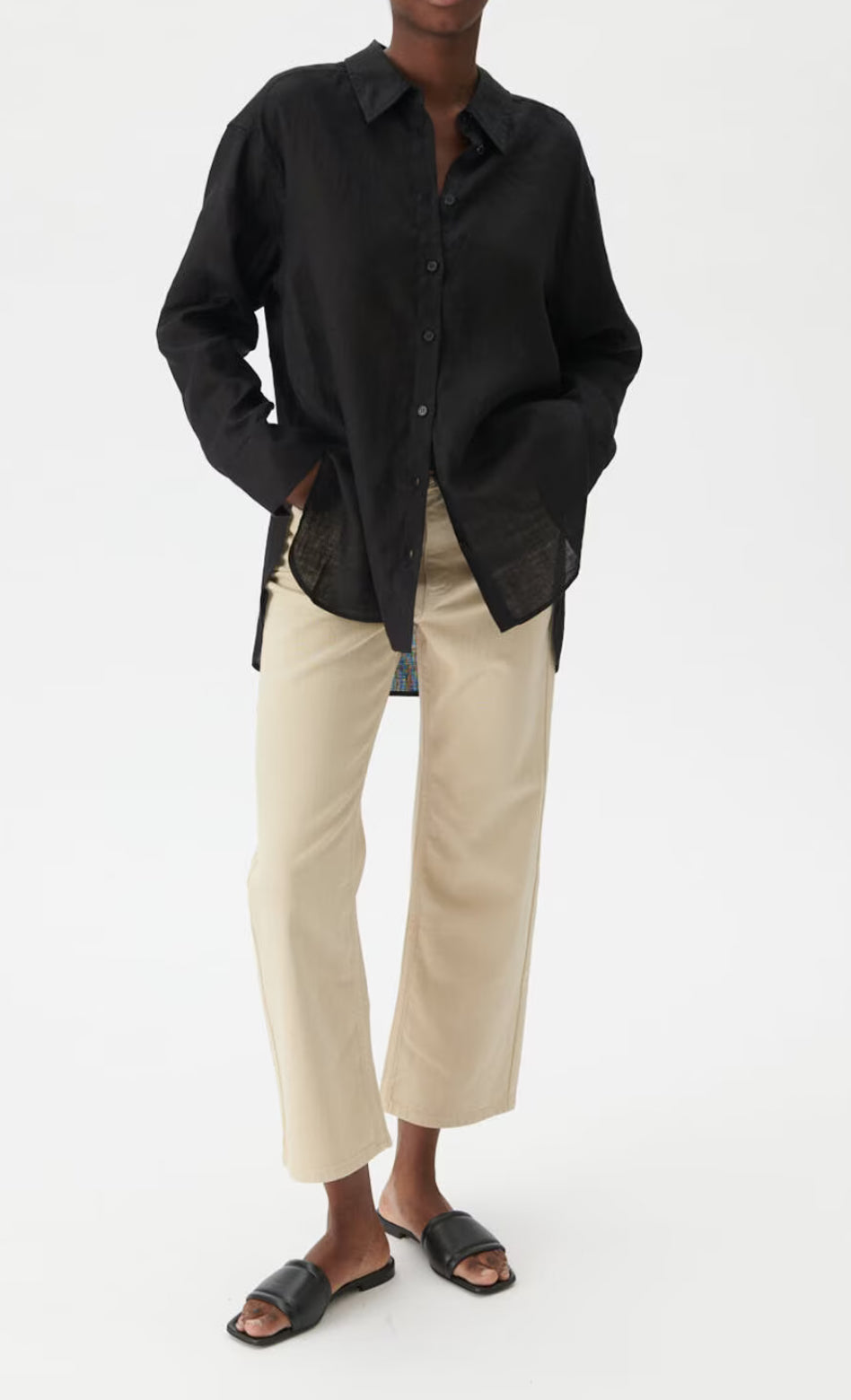 Kelsie är en oversized svart linneskjorta. Den har längre slitsar i sidorna och ärmslut med dubbla knäppning, – storlek upp för en mer oversized look.