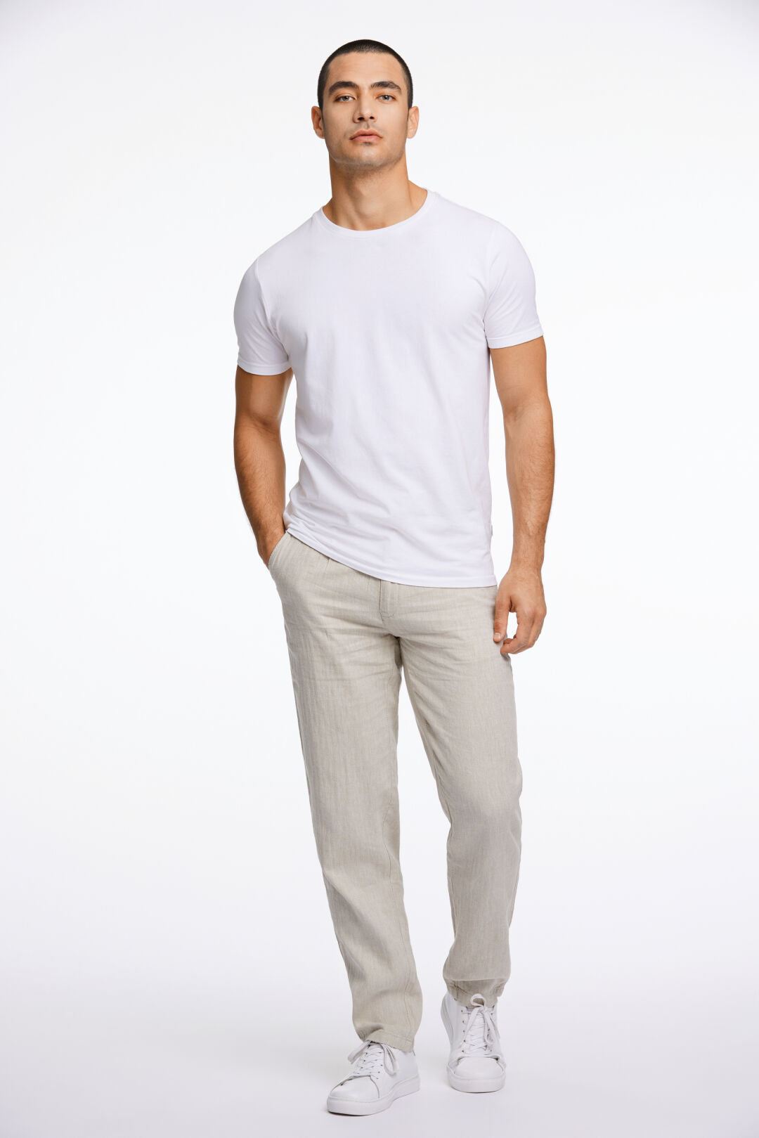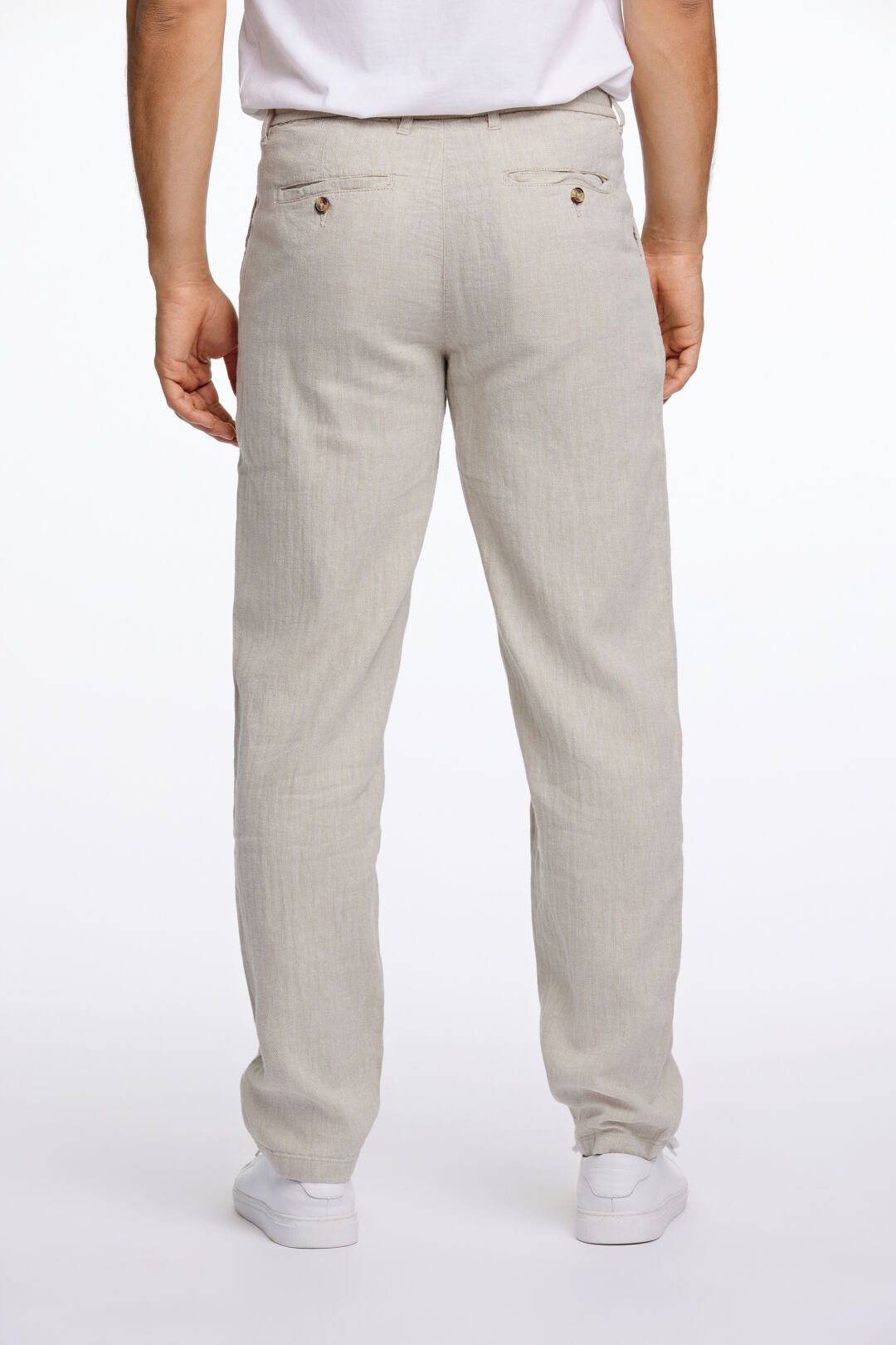 Byxor från Lindbergh White i en behaglig och lätt blandning av bomull och linne. Byxorna har två sidofickor och två passpoalerade bakfickor. Stängs med knapp och dold dragkedja och har även en dragsko i midjan. Tillverkad i avslappnad passform, som är något snävare än vanlig passform men ändå ger rörelsefrihet.