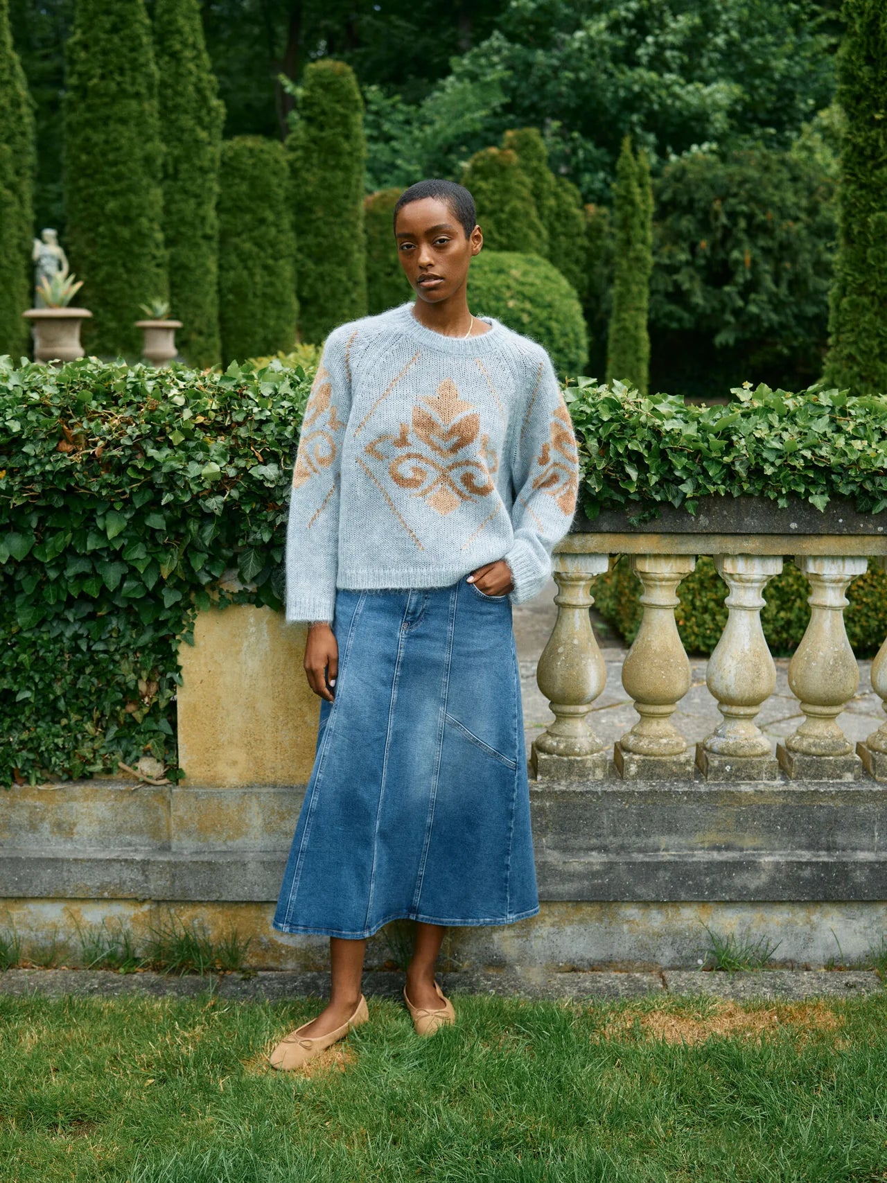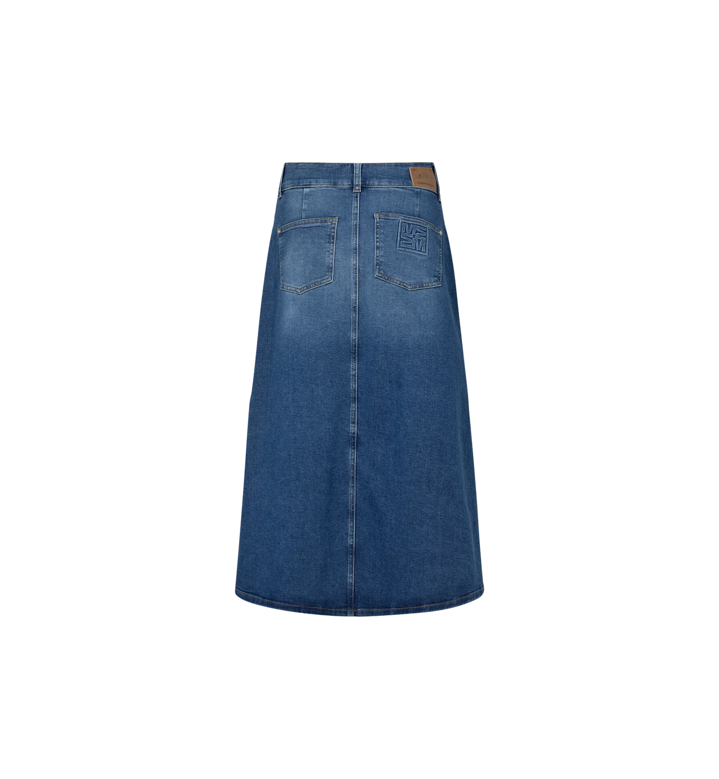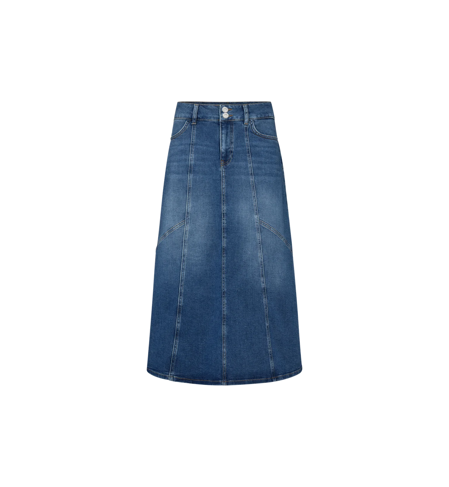 Embrace effortless style with this flattering A-line denim skirt, designed to fall just below the knees. Detailed with multiple cutlines for an edgy touch, it pairs perfectly with a light knit or a statement tee and sneakers for a cool, laid-back vibe.