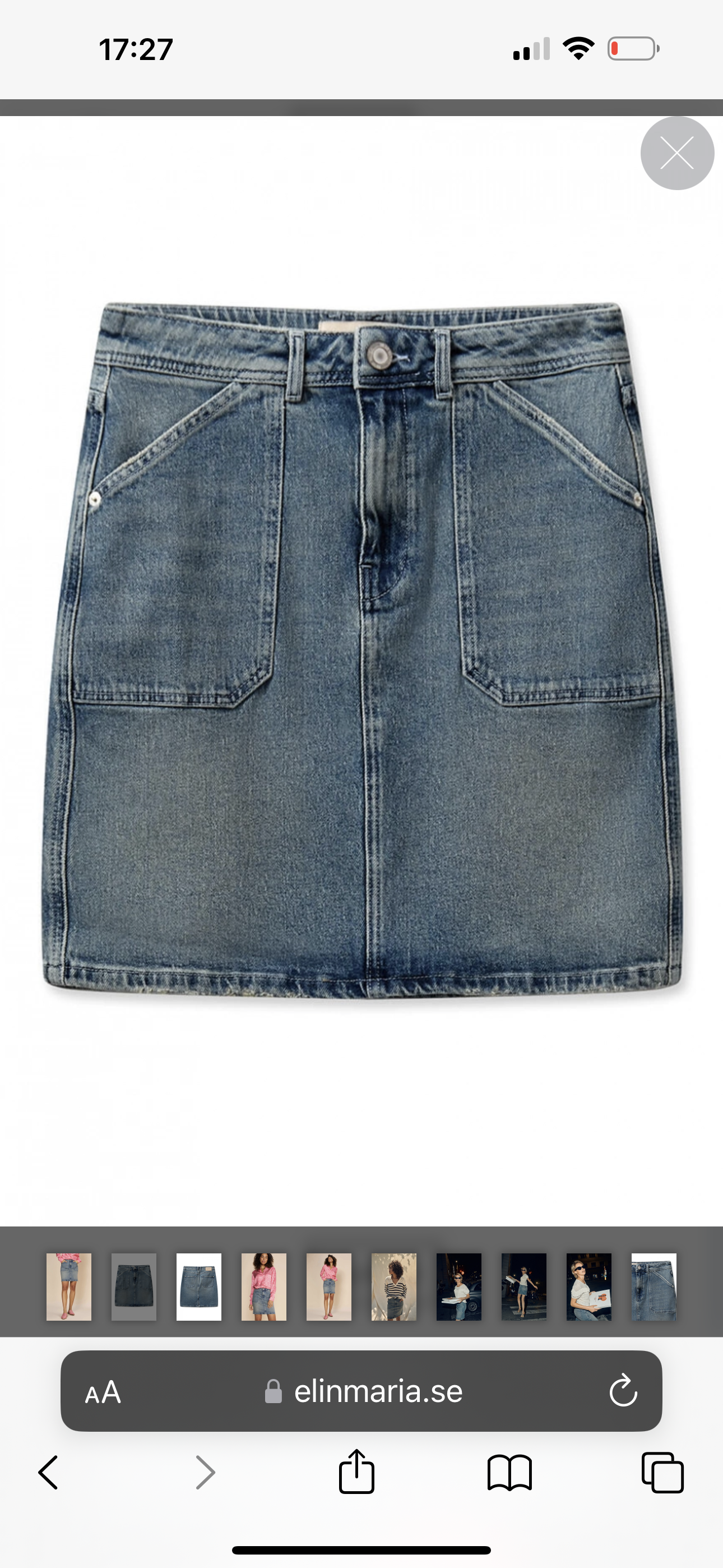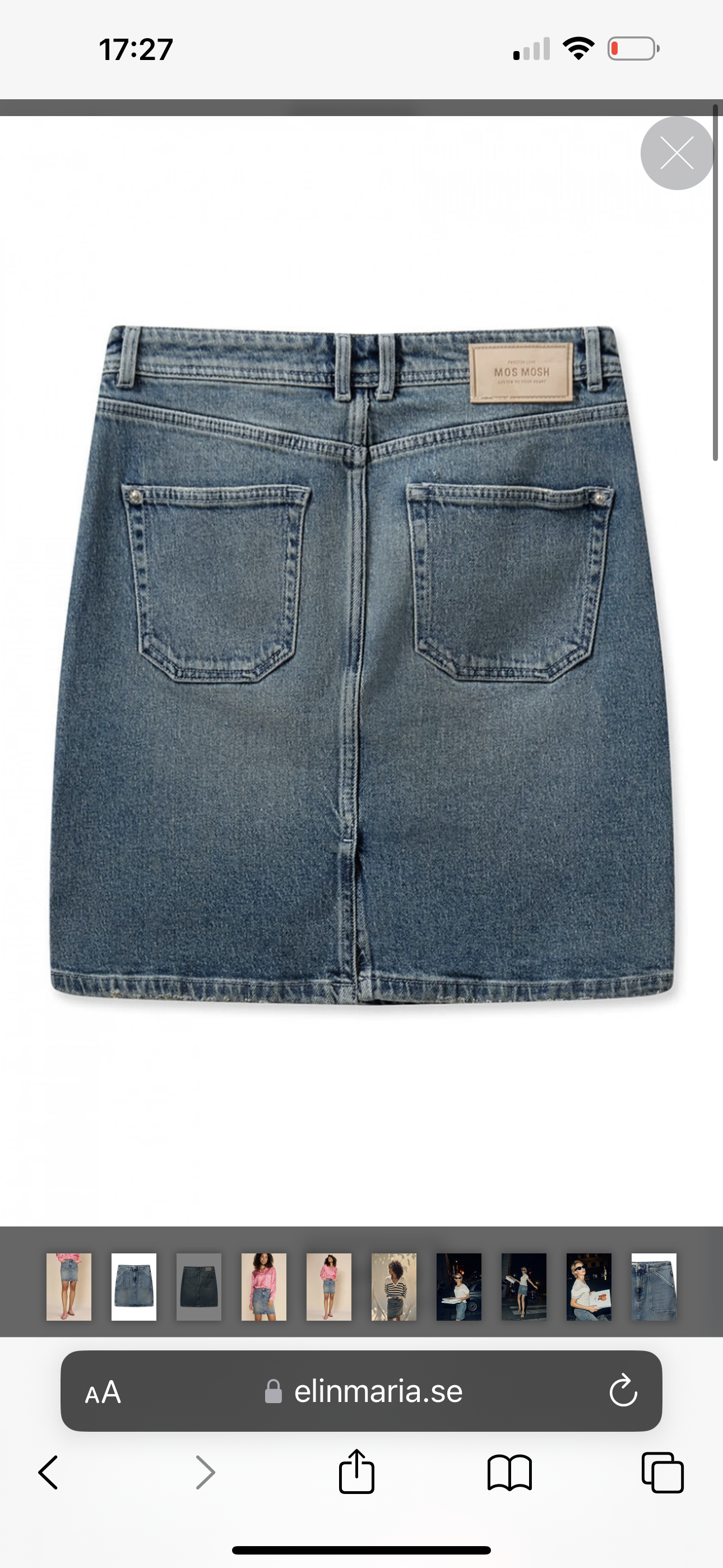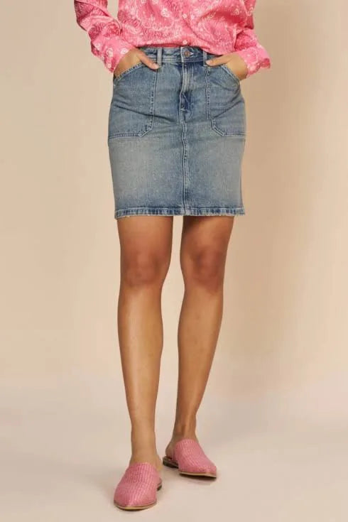 Jeanskjol i bomull med stora fickor fram, liten slits bak och hög midja från MosMosh.