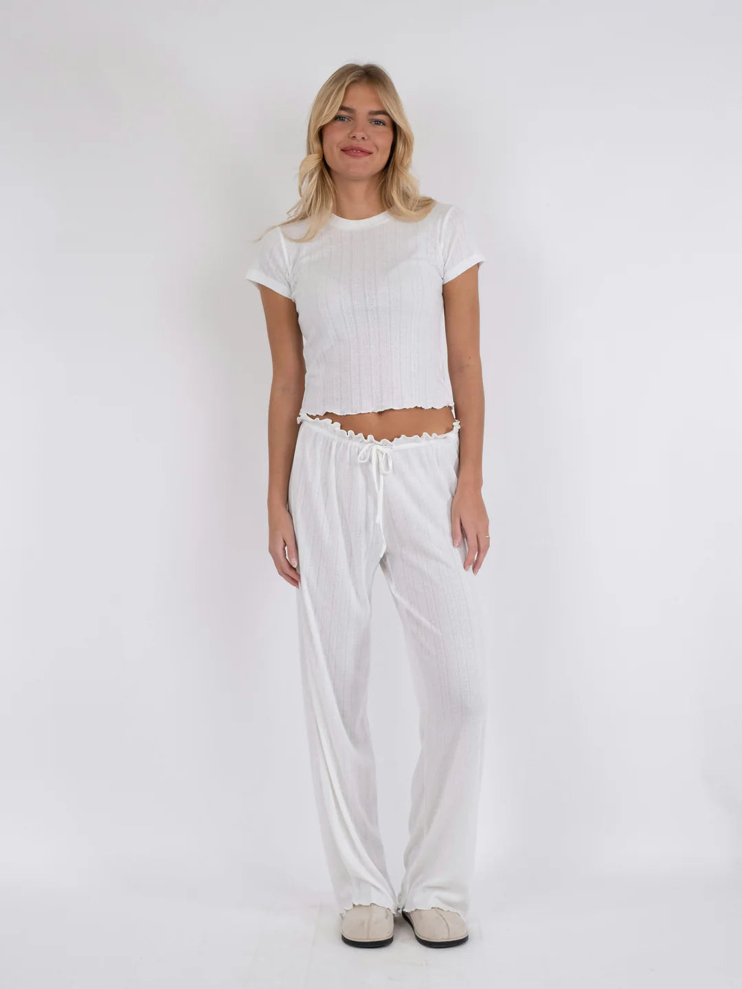 Feminin klänning i vacker broderad kvalitet. Ärmarna har volym med volanger, hög halsringning och knappöppning framtill. Modellen är 176 cm och bär storlek 36.