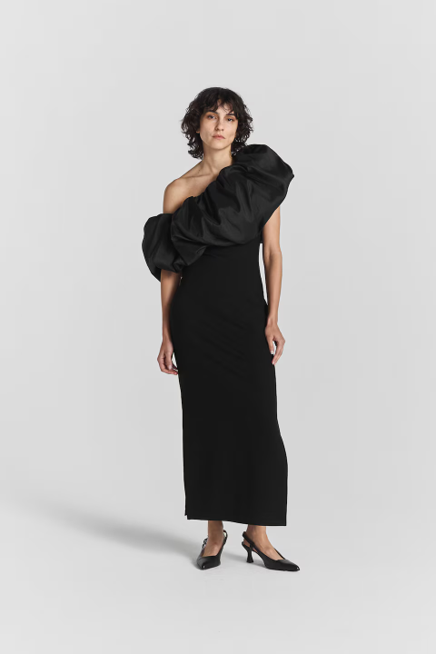 Rosalie Dress: A stunning party dress with a sculptural design, jersey bodycon, hidden side zip, and slits on both sides.