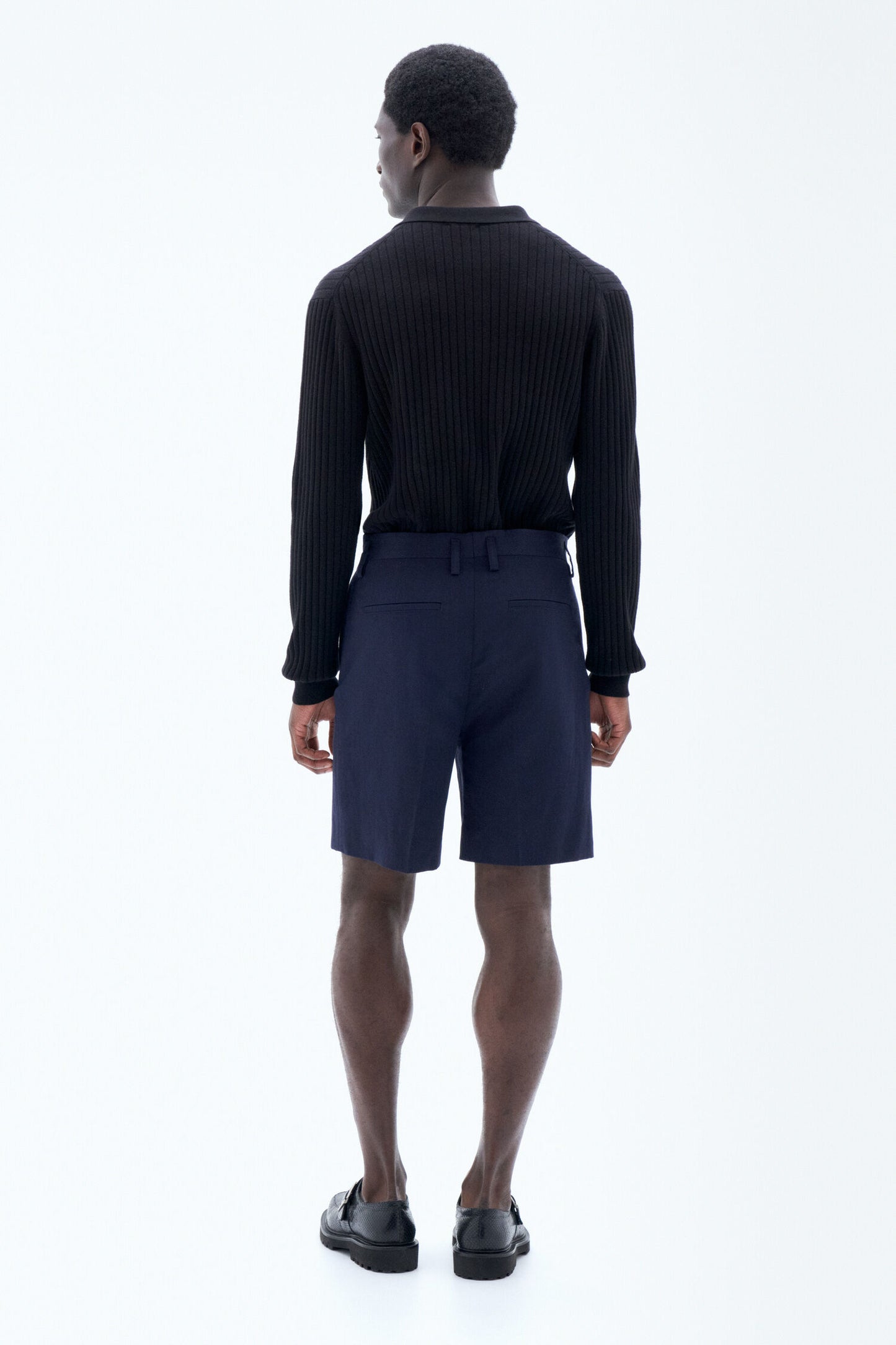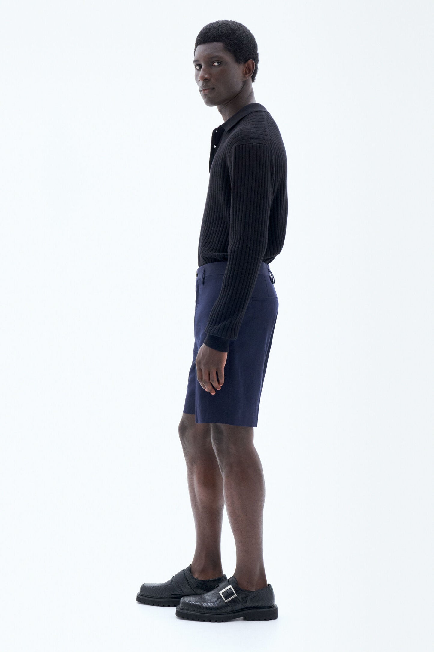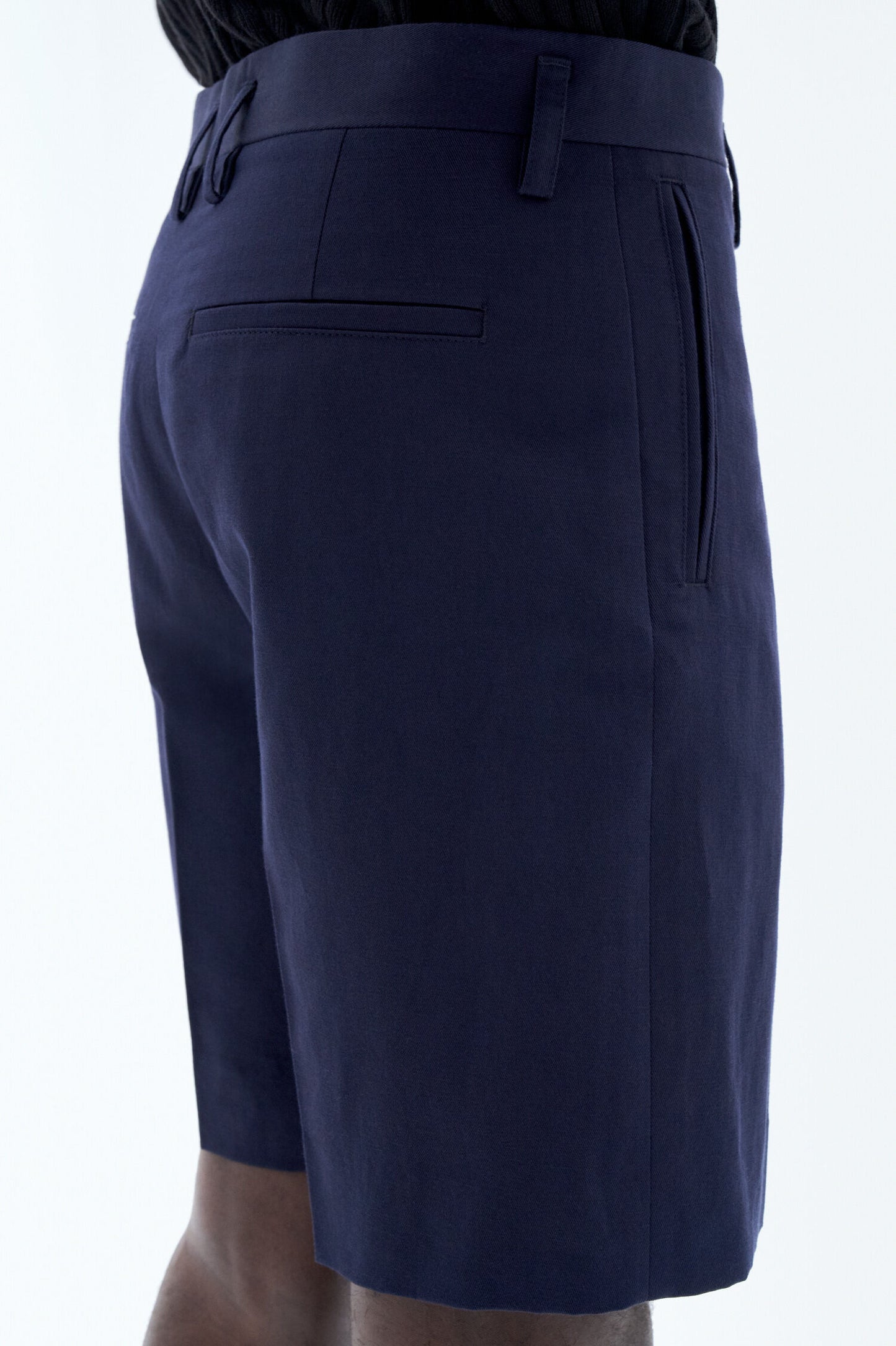 Linen Shorts är skräddarsydda i draperad ekologisk linnetwill i klassisk marinblått. De har en normal passform med medelhög midja, perfekt att bära med ett lätt stickat plagg på våren och sommaren.