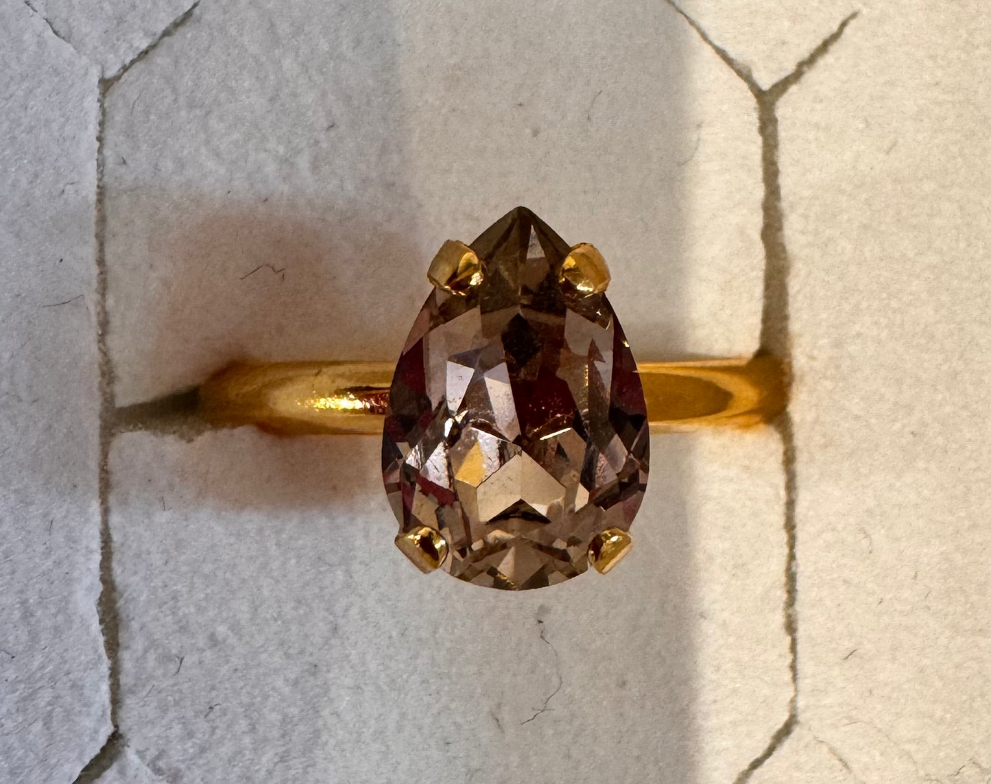 Petite Drop-ringen är en förtjusande ring med en liten droppformad kristall av högsta kvalitet. Basen är tillverkad av 18 karat guld- eller rhodiumpläterad mässing och är justerbar för en perfekt passform. En ring som kompletterar alla stilar, både till vardags och till fest.
